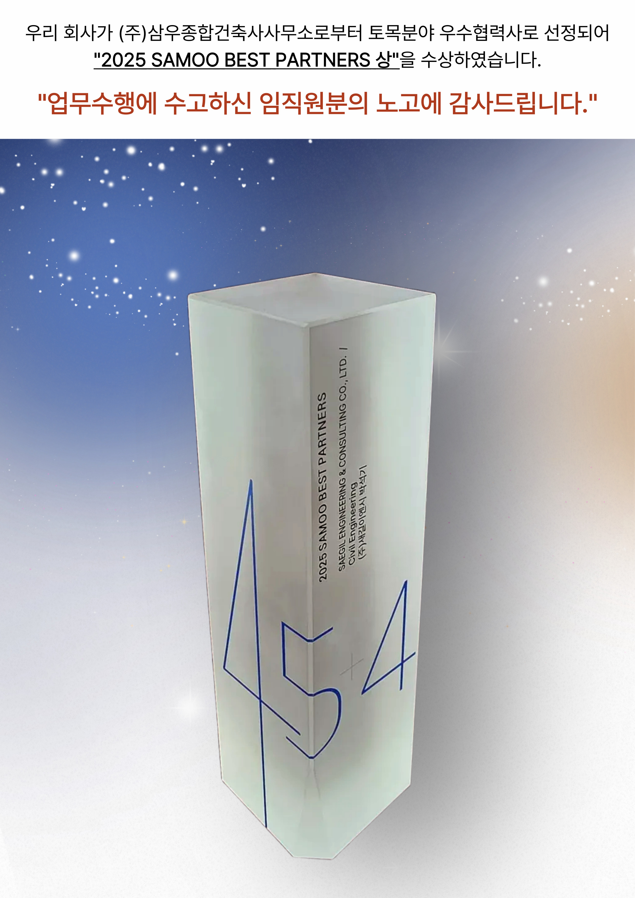 | - | (주)삼우종합건축사사무소 "2025년 토목분야 우수협력사" 선정 | 관리자 | 2025-12-02 |